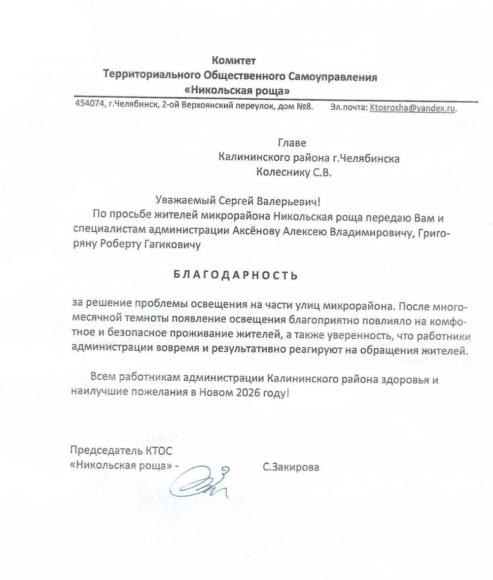 Жители микрорайона Никольская роща выражают благодарность за решение проблемы с освещением. Со своей стороны, мы также благодарим вас за активную гражданскую позицию и конструктивное взаимодействие.